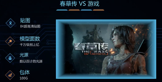 我跟大家分享几个与传统游戏的指标差异:首先是贴图上,在游戏里,贴图决定精细程度,比如之前在游戏开发的过程中,其实对贴图的要求限制非常严格,一般像稍微高质量点的手游,不管是王者荣耀也好或者吃鸡也好,一般会把贴图控制在512~1024,而《春草》使用的是这种8K的超高清的贴图,精度达到了传统手游的64~256倍;在模型面数上,正常的游戏,也是这种品质稍微较高的手游,它的同屏渲染面数一般会控制在几十万,最多不会过100万,而《春草》因为加上UE5这种特性的加持,我们目前面数已经达到了千万级别的面塑;另外是场景里的光源,这个决定了场景里的光影效果,包括立体感和明暗层次,消耗也是比较大的,所以正常游戏开发中用得很谨慎,比如游戏的一个场景内,一般会把这种动态的光源数量控制在个位数,但《春草》为了达到这种更好的效果,用的实时光可以算是数以百计;第四个是包体大小,包体大小决定了用户安装的体验,如果咱们在座的有做过推广的大佬,可能也会了解包体对推广期,尤其用户导量的影响非常大,目前《春草》是差不多做了20分钟左右的内容量,包体大概在100G左右。我给大家举几款游戏的例子,比如说前段时间特别火的《赛博朋克2077》,裸包大小大概在70个G,《原神》的电脑游戏主机包,大小也在70个G左右,一般比较高品质的手游一般会控制在一两个G或者,再多几个G左右就已经到顶了,《原神》是其中比较夸张的,手机包目前能是20个G。但是现在《春草》虽然在100个G左右,然而用户真的想去体验的时候,也只是下一个几十兆的端就可以直接体验到了。