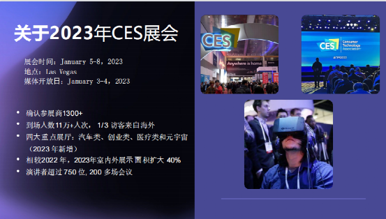 我们看到的品牌在CES有各种领域的,我今天想分享的三个领域。总体的一个感受是觉得CES在2023年,当然算是疫情后的第一次的举办,比往年,我个人觉得有一个很重要的转变,是感觉有恢复正常的一个迹象。我最近看到的总参加2023年CES的人数应该是超过10万人次,这个应该是11、12万左右,比他们预估的还多,当然是比疫情期间多很多。如果说疫情之前,气氛和总体的环境和热度可能还是欠缺一点点,但是对于我来说能在线下见到人、能握握手、认识朋友,在本地我觉得还是一个很好的信号,2023年很好的开始。所以大家都已经非常熟悉CES是全美最大的展会的活动,举办的时间各位应该也是比较清楚。