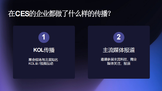 如果品牌知名度提高,但是你的可信度不提高的话,你每次做宣传,人看到的是一个不可信的形象,或者是感觉这个公司不是本地的,每次投放广告你就是害自己,伤害自己。如果做好基础设施,你把品牌可信度提高,就是说我们有本地的媒体报道,我们有主流社媒KOL给我们宣传,做了视频,这个公司在本地有朋友,这个公司在本地在做具体的事情,这个背书和可信度是更好的,在这个基础上做营销推广,效果会非常不一样。如果考虑到这两个因素,我观察到的一个很重要的在CES的宣传手段,当然是KOL的传播,那就是社交媒体的意见领袖的宣传。