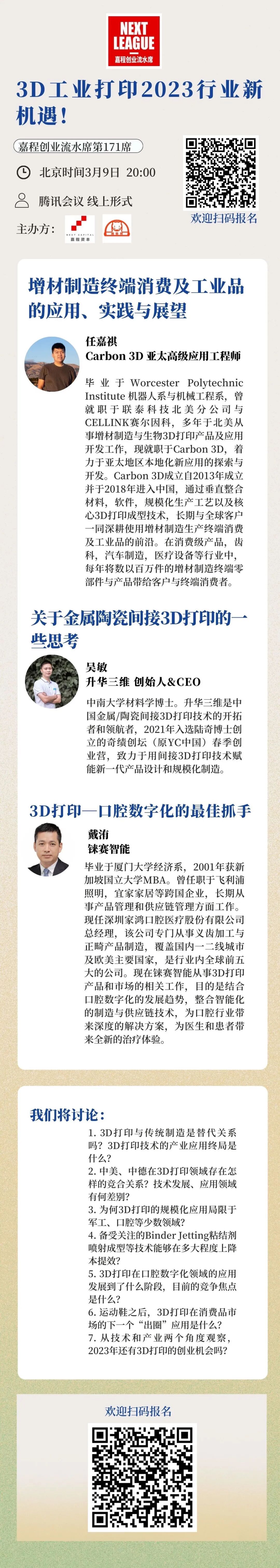 3月9日,本周四晚8点,热爱创新的嘉程资本携手南极熊3D打印网开启嘉程创业流水席第171席!我们邀请了Carbon 3D 亚太高级应用工程师任嘉祺、升华三维科技有限公司创始人&CEO吴敏、铼赛智能口腔数字化负责人戴洧三位嘉宾,在线讨论3D工业打印2023行业新机遇!我们将探讨3D打印技术的应用场景、商业机会和发展趋势,并深入讨论其中的创业机会!欢迎各位科技领域的创新者、投资人和产业上下游的行业人士一起参加!