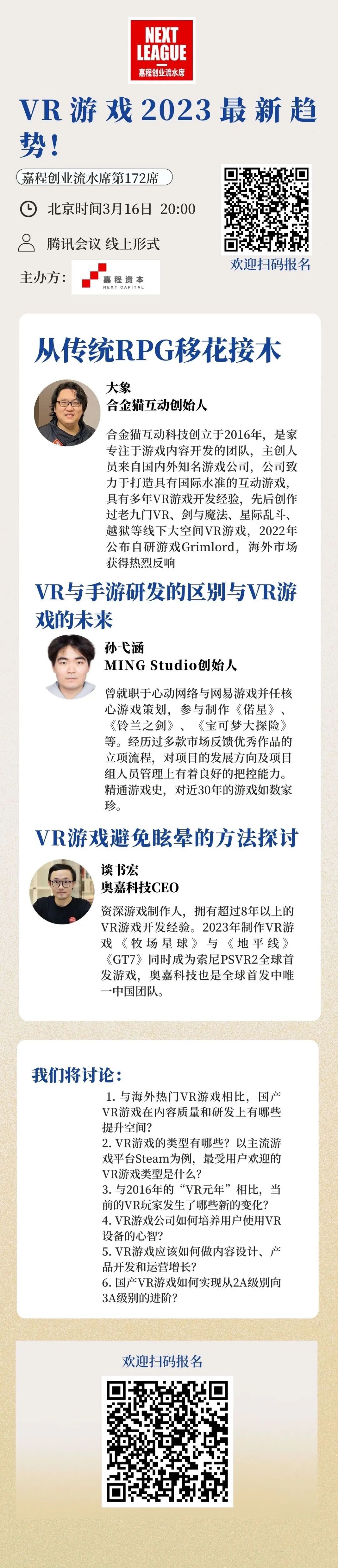 3月16日,本周四晚8点,热爱创新的嘉程资本开启嘉程创业流水席第172席!我们邀请了合金猫工作室CEO大象、鸣坤游戏CEO孙弋涵、奥嘉科技CEO谈书宏三位嘉宾,在线讨论VR游戏行业2023的新机遇!我们将探讨VR游戏的行业动态、市场状况与商业创新,并深入讨论其中的创业机会!欢迎各位科技领域的创新者、投资人和产业上下游的行业人士一起参加!