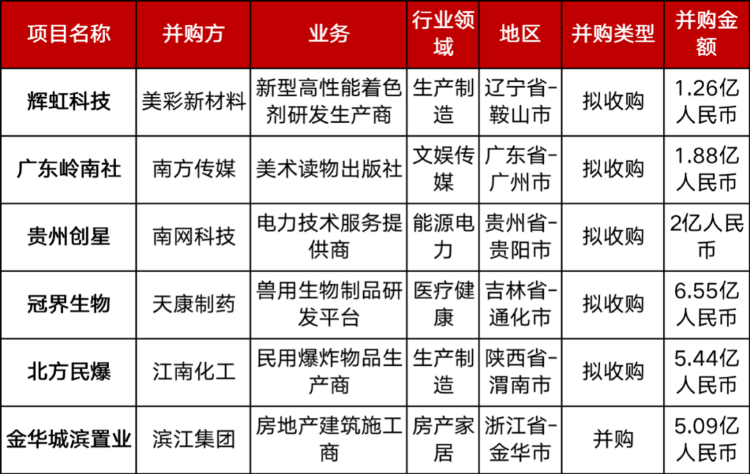 本周共有6起1亿人民币以上的并购事件。