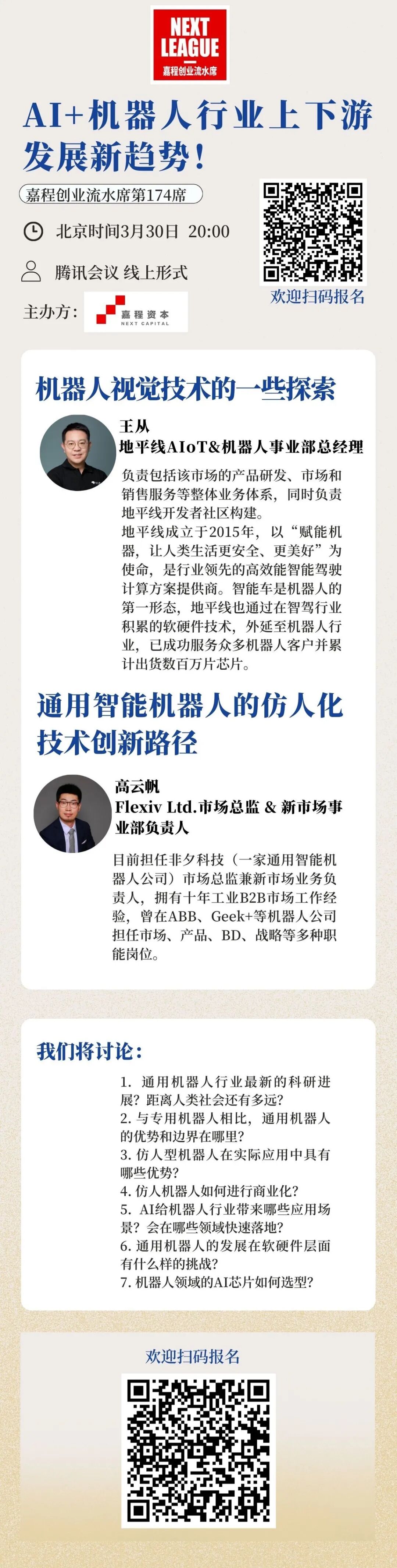 未来,机器人产品除了在硬件上向着轻型化、柔性化发展,软件上智能化也会是一个确定的方向,而最新的AI技术让我们看到了无限的可能。3月30日,本周四晚8点,热爱创新的嘉程资本开启嘉程创业流水席第174席!我们邀请了地平线AIoT&机器人事业部总经理王丛、Flexiv Ltd.市场总监&新市场事业部负责人高云帆两位重量级嘉宾,在线讨论2023年AI+机器人行业上下游发展的最新机遇!欢迎各位机器人和AI领域相关的创业者、技术大牛、投资人和产业上下游的专家们一起参加!
