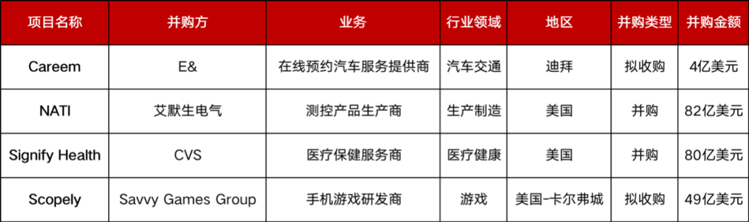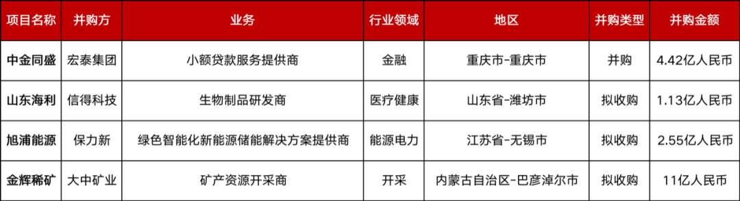本周共有4起1亿人民币以上的并购事件