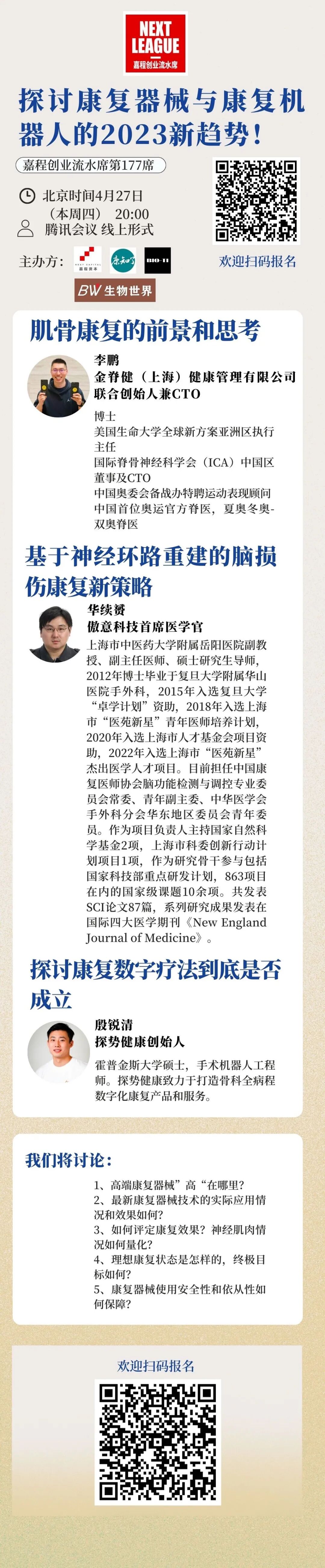 新型康复器械属于高精尖的医疗设备,行业壁垒高,研发周期长、资金投入大,且市场对新型康复器械缺乏认知,产品的推广成本偏高,企业发展还需摸索路径,探索更成熟的商业模式,盘活国内近千亿的蓝海市场。4月27日,本周四晚20点,热爱创新的嘉程资本携手生物世界、康知了、BIO-TI开启嘉程创业流水席第177席!我们邀请了金脊健联合创始人李鹏、傲意科技华续赟、探势健康创始人殷锐清,一起深度探讨康复器械的创新趋势和前沿技术!欢迎各位康复器械领域上下游的从业者、创业者、投资人和行业专家一起参加!