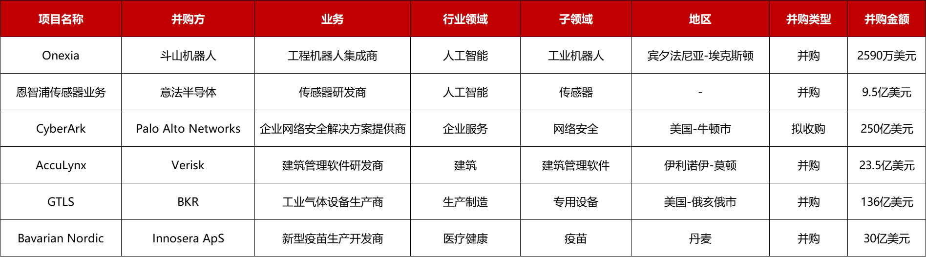 本周共有6起1亿美元以上的收购并购: