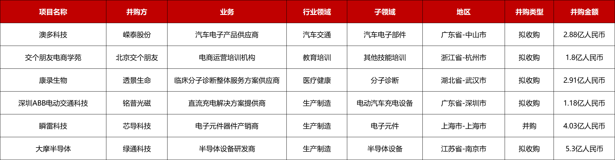 本周共有8起1亿人民币以上的并购事件: