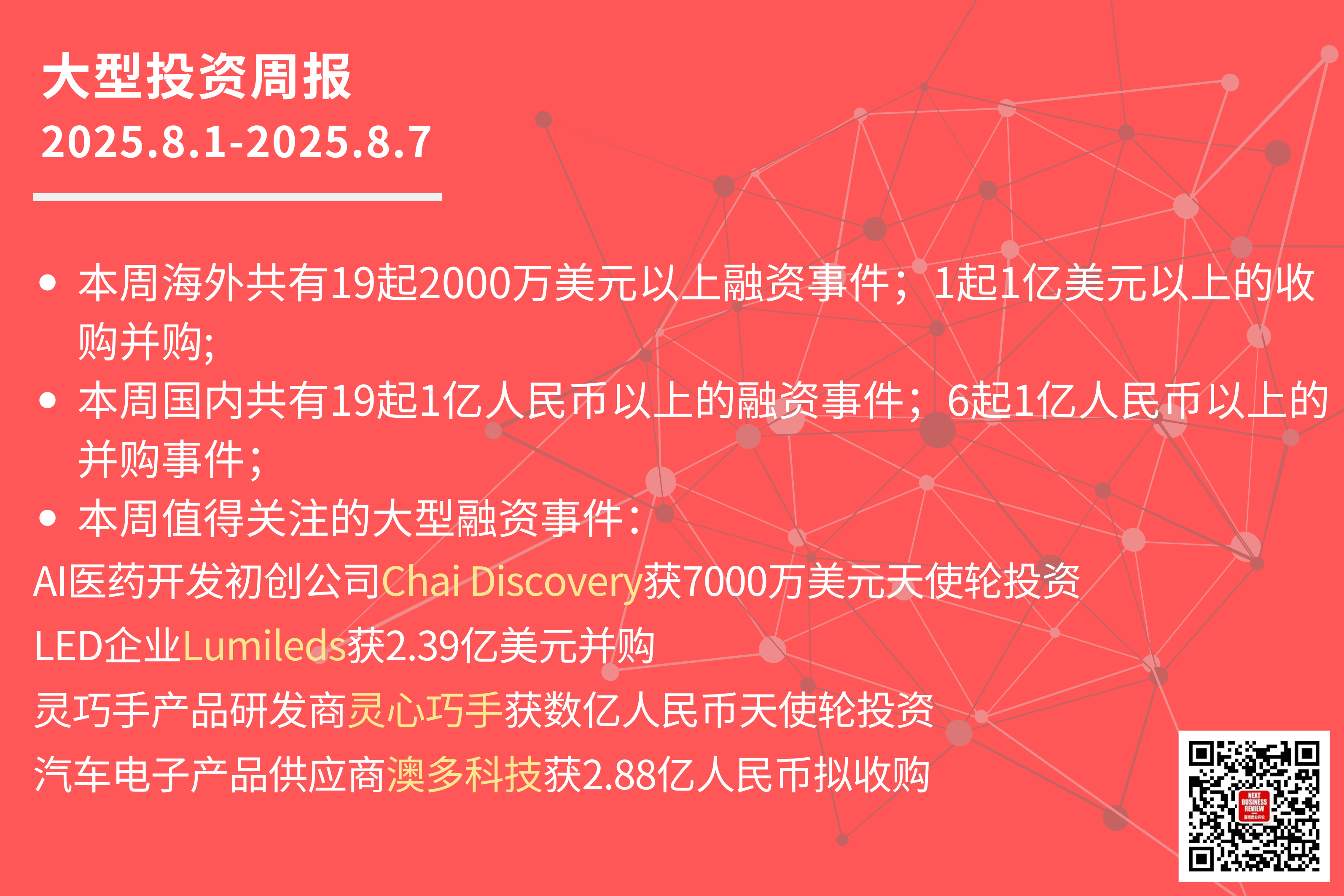 本周共有19起2000万美元以上的海外融资事件,其中: