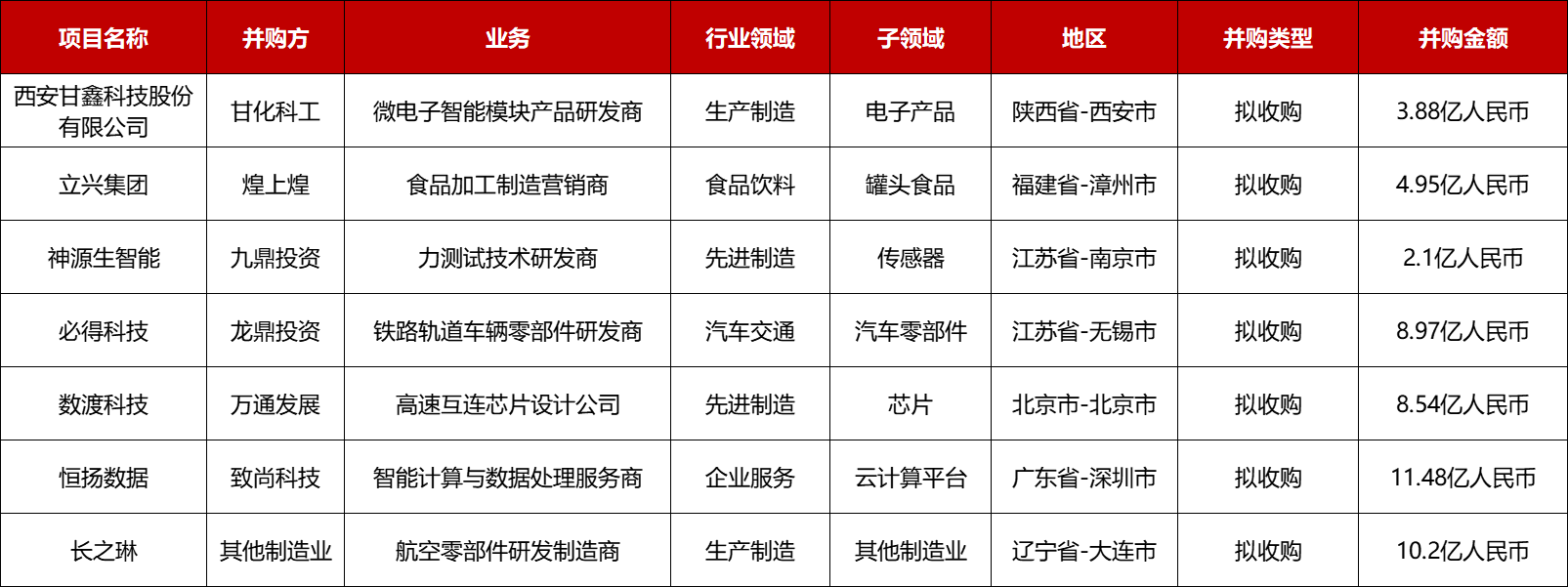 本周共有7起1亿人民币以上的并购事件: