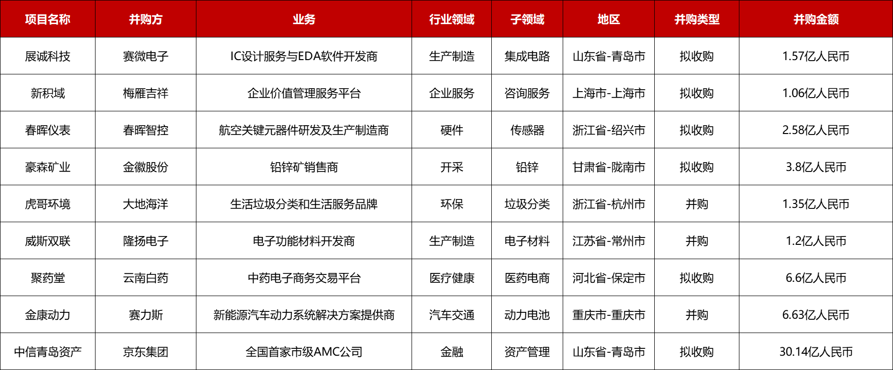 本周共有9起1亿人民币以上的并购事件: