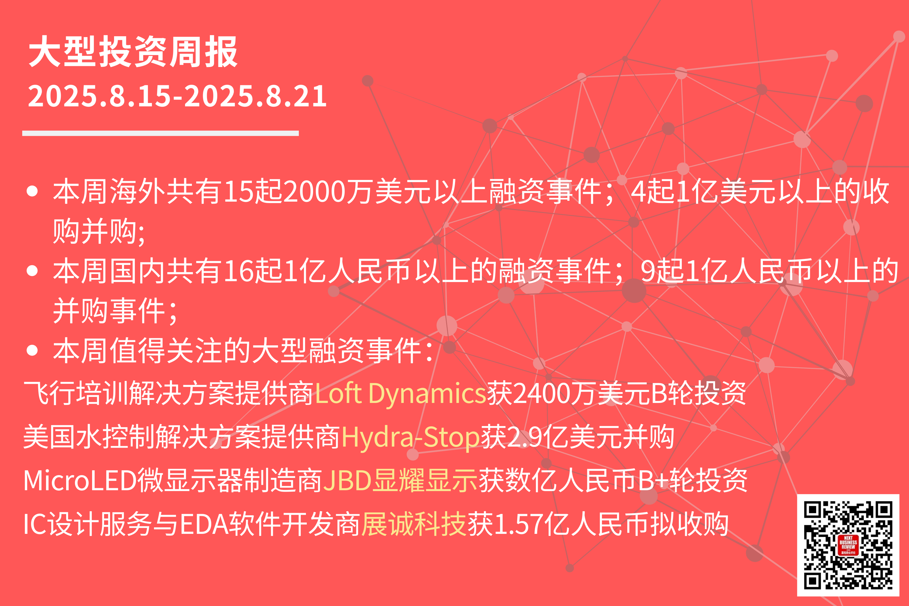 本周共有15起2000万美元以上的海外融资事件,其中: