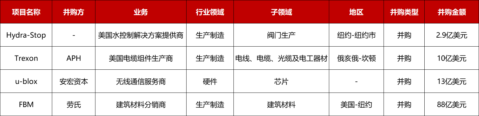 本周共有4起1亿美元以上的收购并购: