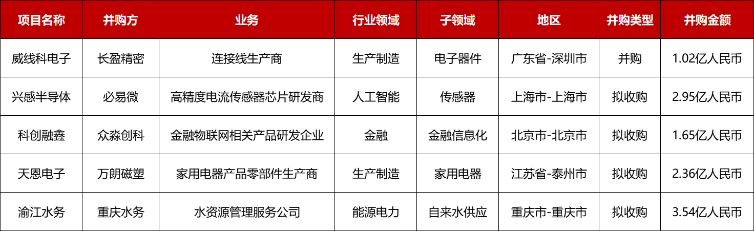 本周共有5起1亿人民币以上的并购事件: