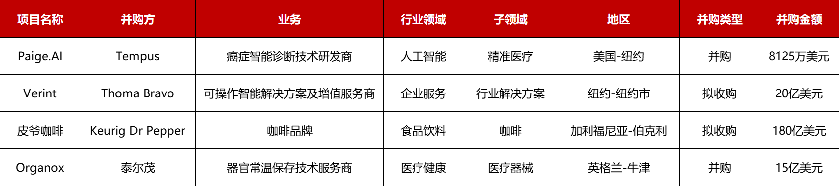 本周共有4起1亿美元以上的收购并购: