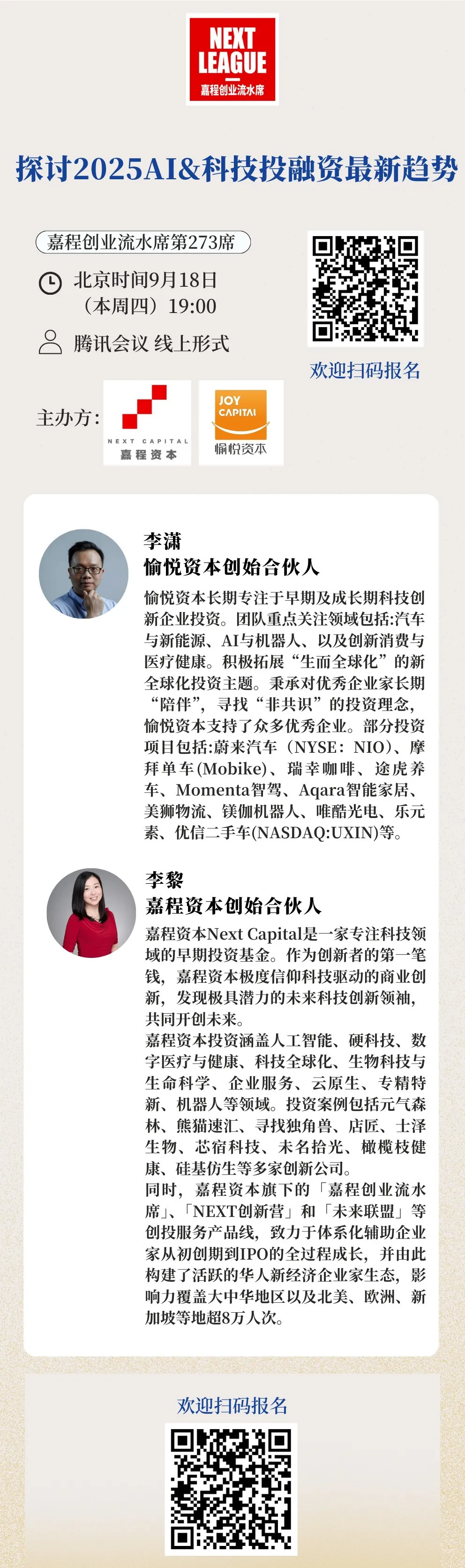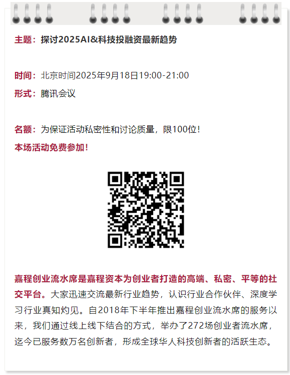 9月18日,本周四晚19:00,热爱创新的嘉程资本开启嘉程创业流水席第273席!我们邀请了愉悦资本创始合伙人李潇、嘉程资本创始合伙人李黎一起深度探讨2025AI&科技投融资最新趋势!欢迎各位从业者、创业者、投资人和行业专家一起参加!