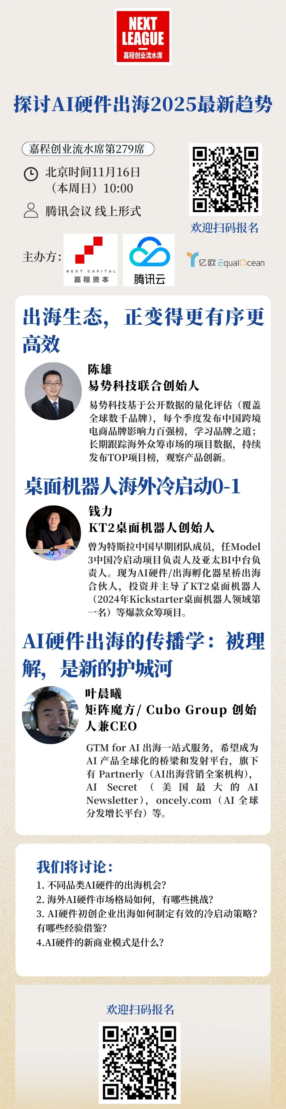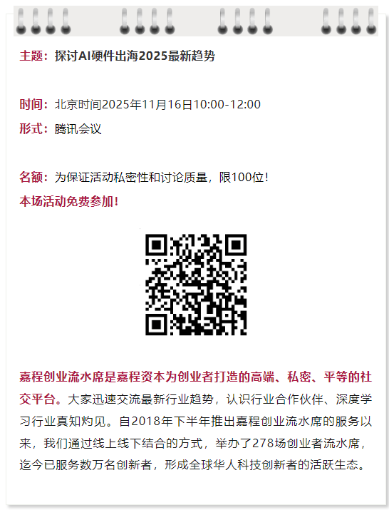 11月16日,本周日上午10:00,热爱创新的嘉程资本携手腾讯云、Equal Ocean开启嘉程创业流水席第279席!我们邀请了矩阵魔方/Cubo Group创始人兼CEO叶晨曦、KT2桌面机器人创始人钱力、易势科技创始人陈雄一起深度探讨AI硬件出海2025最新趋势!欢迎各位关注出海创业的研发人员、创业者、投资人和行业专家一起参加!