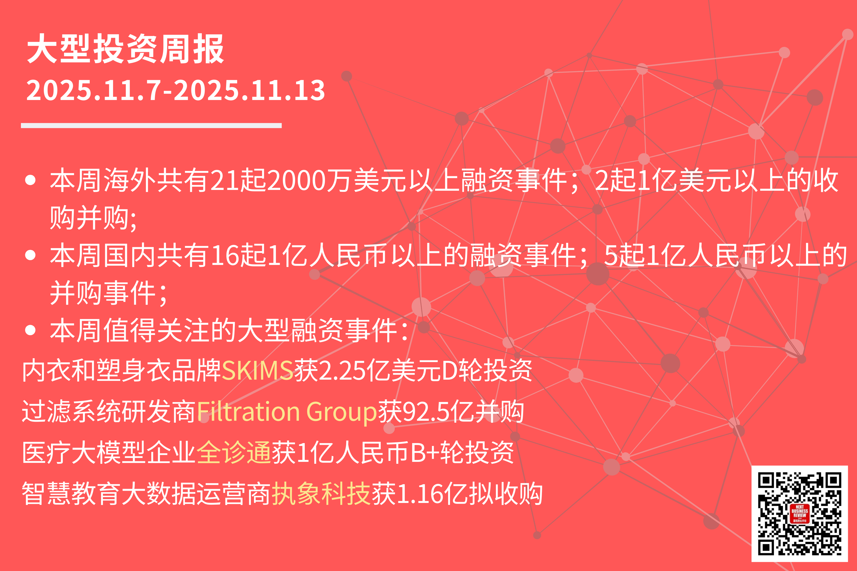 本周共有21起2000万美元以上的海外融资事件,其中: