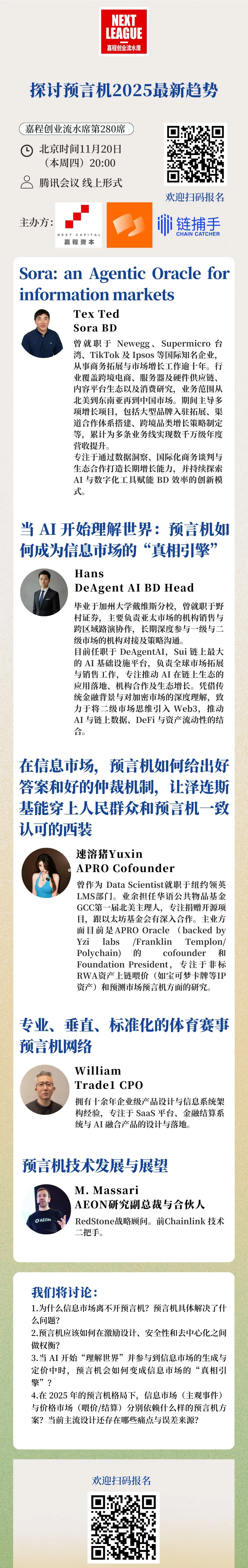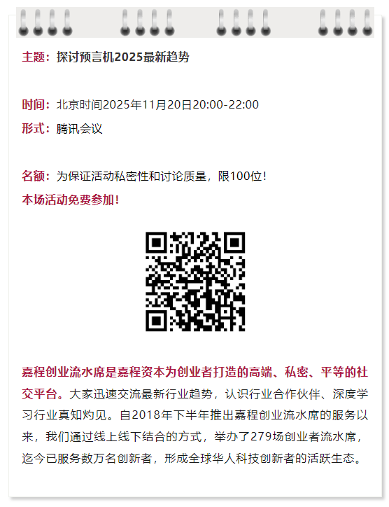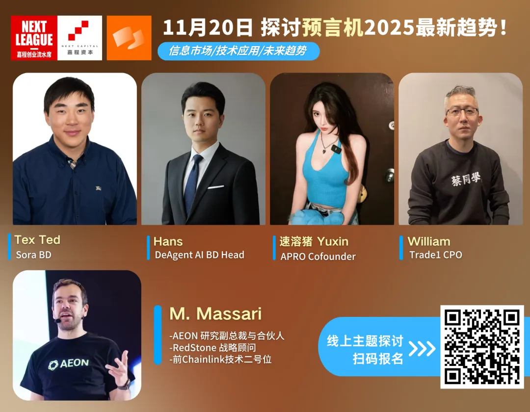 11月20日,本周四晚20:00,热爱创新的嘉程资本携手Rootdata开启嘉程创业流水席第280席!我们邀请了Sora BD Tex Ted、Deagent AI BD Head Hans、APRO Cofounder 速溶猪 Yuxin、Trade1 CPO William、AEON研究副总裁与合伙人 M. Massari一起深度探讨预言机2025最新趋势!欢迎各位关注预言机的研发人员、创业者、投资人和行业专家一起参加!