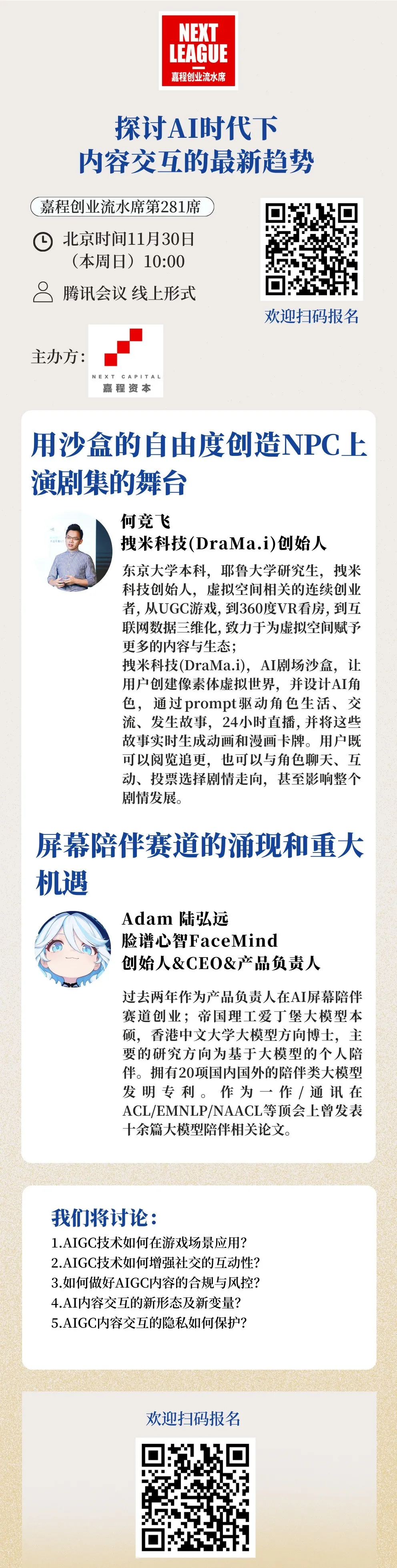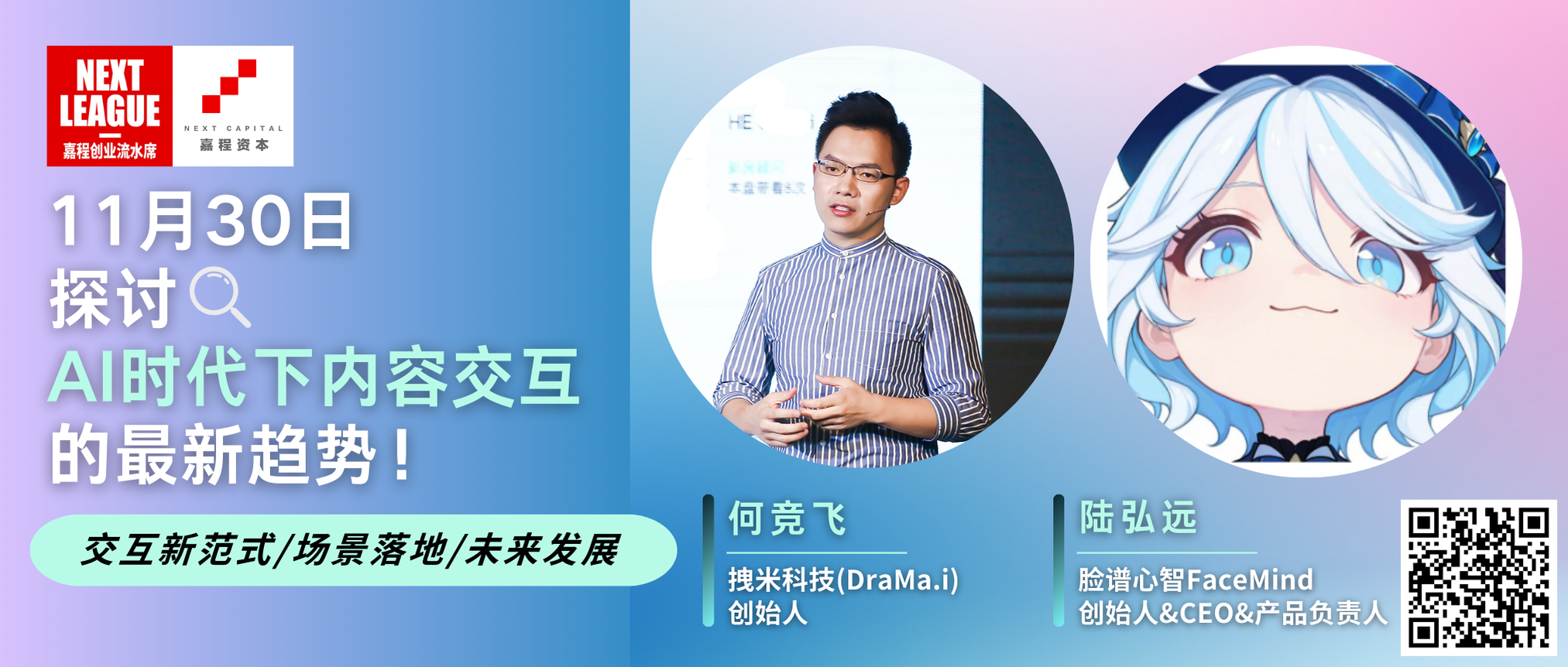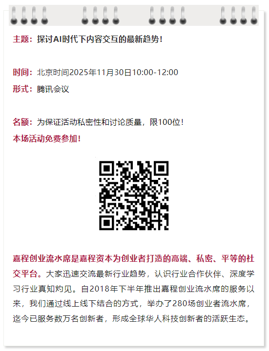11月30日,本周日上午10:00,热爱创新的嘉程资本开启嘉程创业流水席第281席!我们邀请了拽米科技创始人何竞飞、脸谱心智FaceMind创始人陆弘远一起深度探讨AI时代下内容交互2025的最新趋势!欢迎各位关注AI内容交互的研发人员、创业者、投资人和行业专家一起参加!