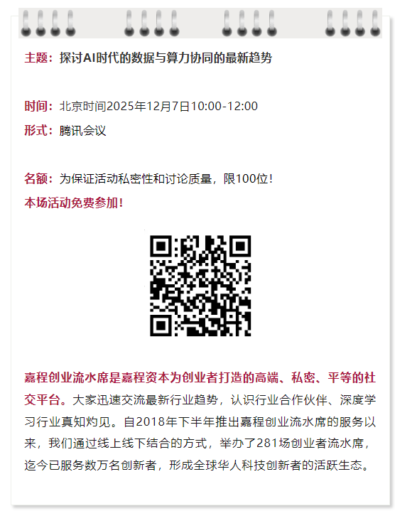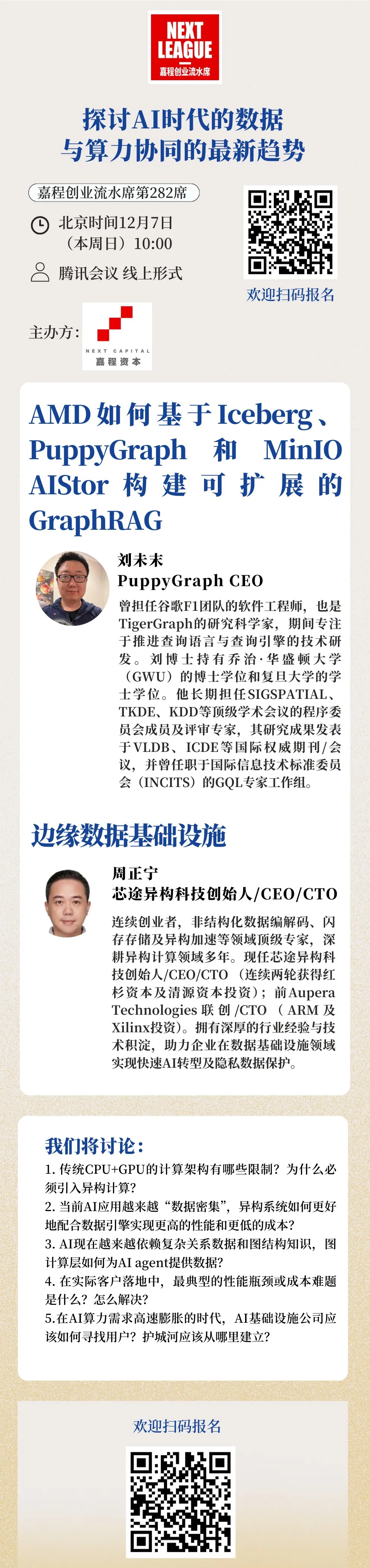 12月7日,本周日上午10:00,热爱创新的嘉程资本开启嘉程创业流水席第282席!从数据系统、图计算引擎到异构算力与AI原生架构,我们邀请了PuppyGraph创始人刘未末、芯途异构创始人周正宁一起深度探讨AI时代的数据与算力协同的最新趋势!欢迎各位关注AI基础设施的研发人员、创业者、投资人和行业专家一起参加!