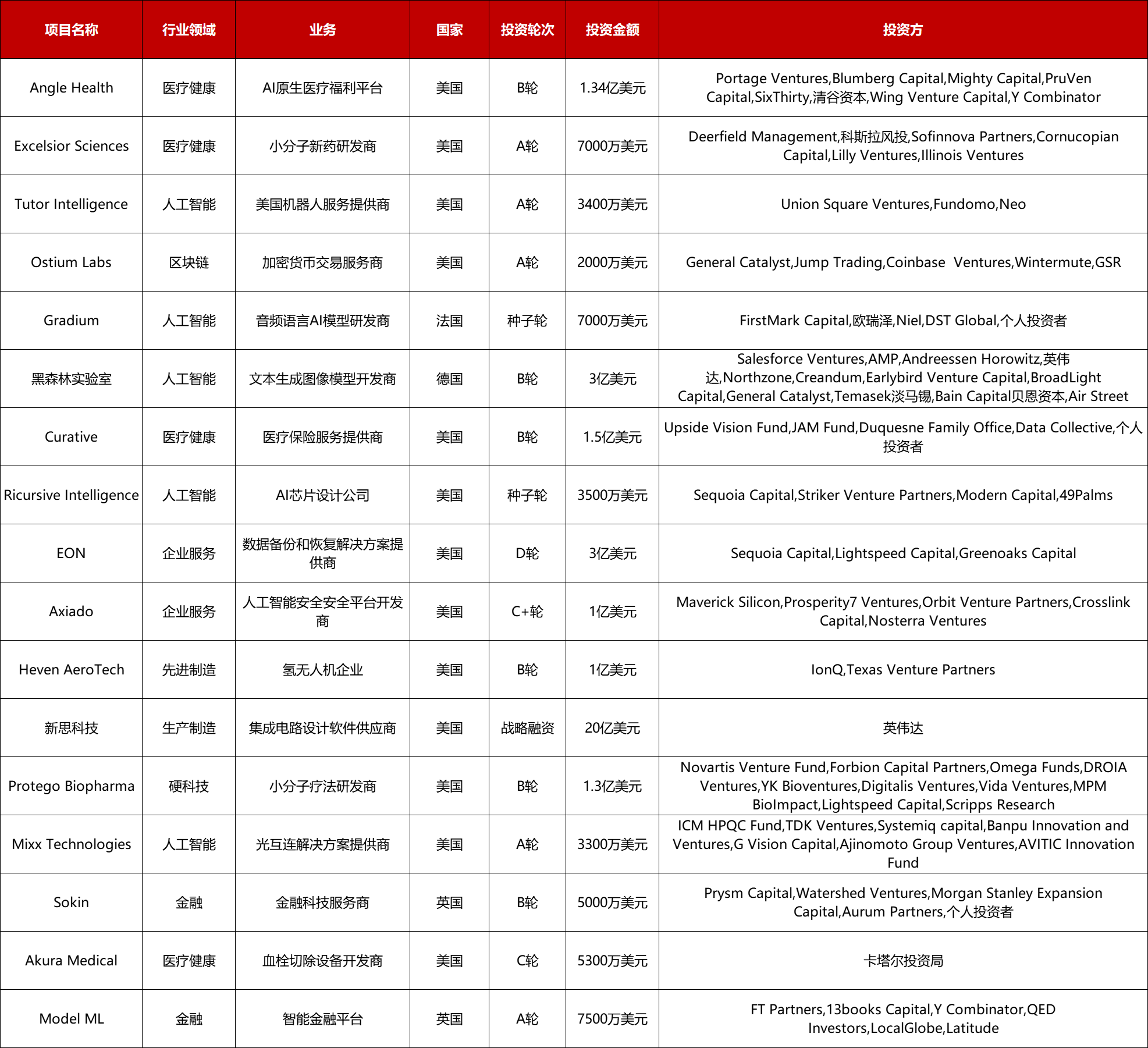 活跃的行业为人工智能(5)、医疗健康(4),
