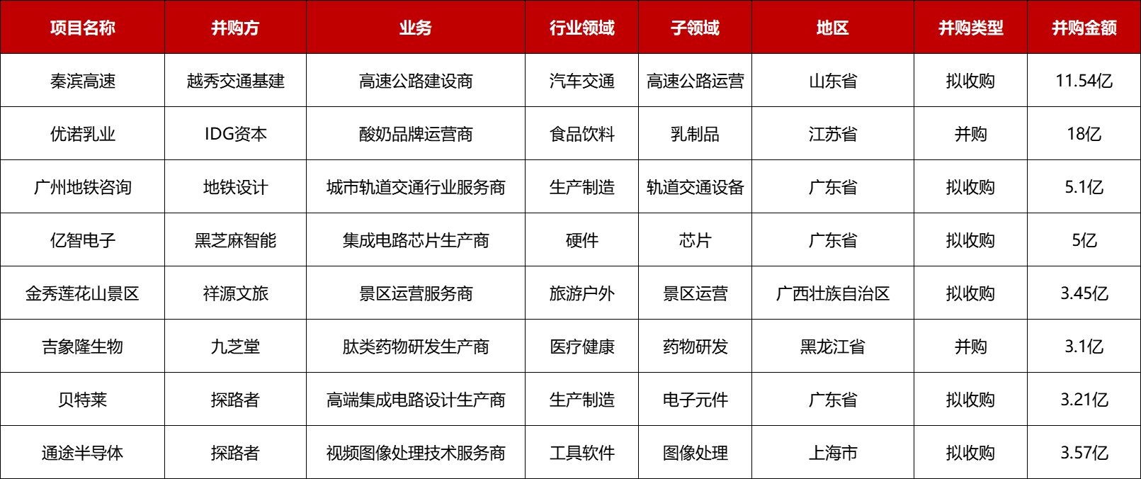 本周共有8起1亿人民币以上的并购事件: