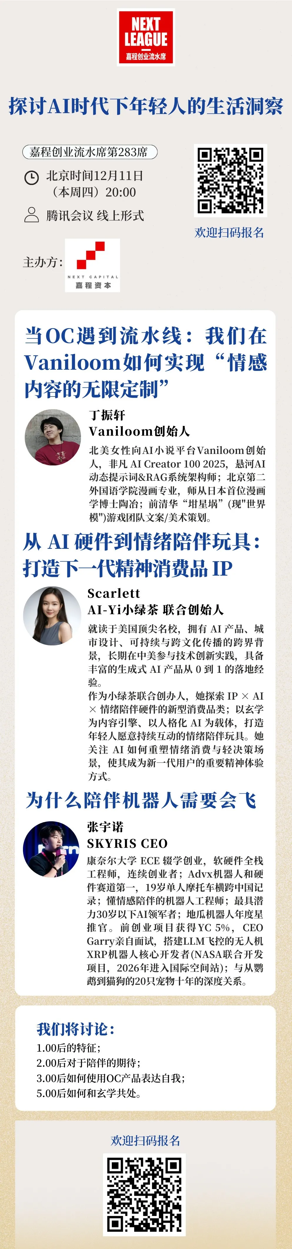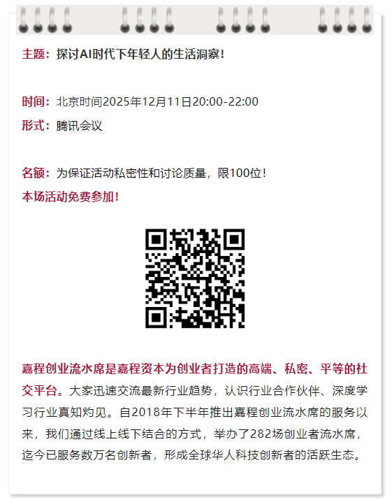 12月11日,周四晚20:00,热爱创新的嘉程资本开启嘉程创业流水席第283席!我们邀请了SKYRIS CEO 张宇诺、Vaniloom 创始人丁振轩、AI-Yi小绿茶联合创始人Scarlett一起深度探讨AI时代下年轻人的生活洞察!欢迎各位关注AI陪伴与社交的研发人员、创业者、投资人和行业专家一起参加!