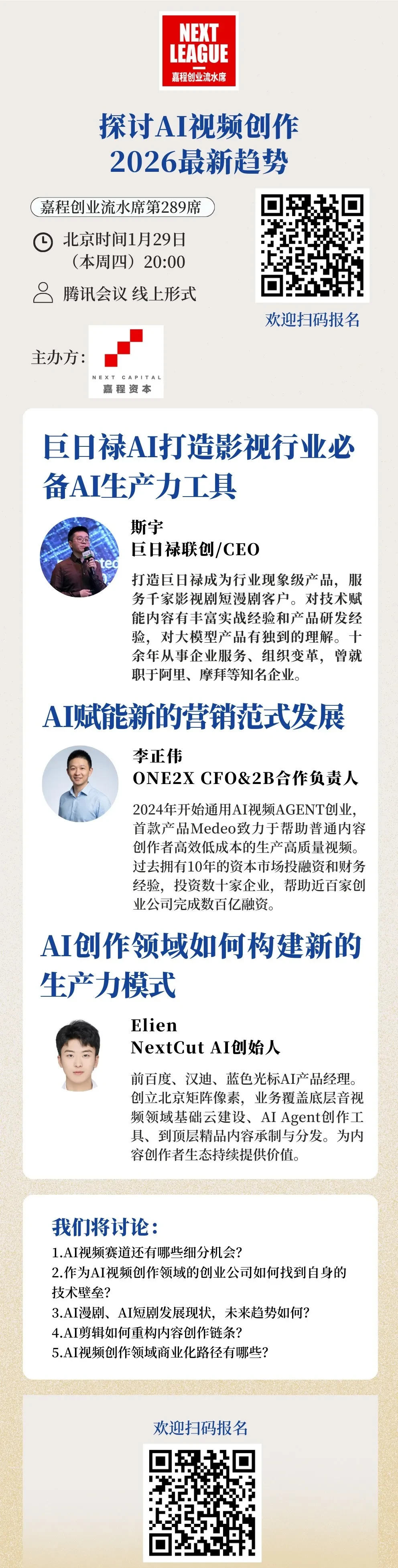 1月29日,本周四晚20:00,热爱创新的嘉程资本开启嘉程创业流水席第288席!我们邀请了巨日禄AI联创&CEO斯宇、One2x CFO李正伟、NextCutAI创始人Elinen一起深度探讨AI 视频创作2026最新趋势!欢迎各位关注AI 视频创作的研发人员、创业者、投资人和行业专家一起参加!