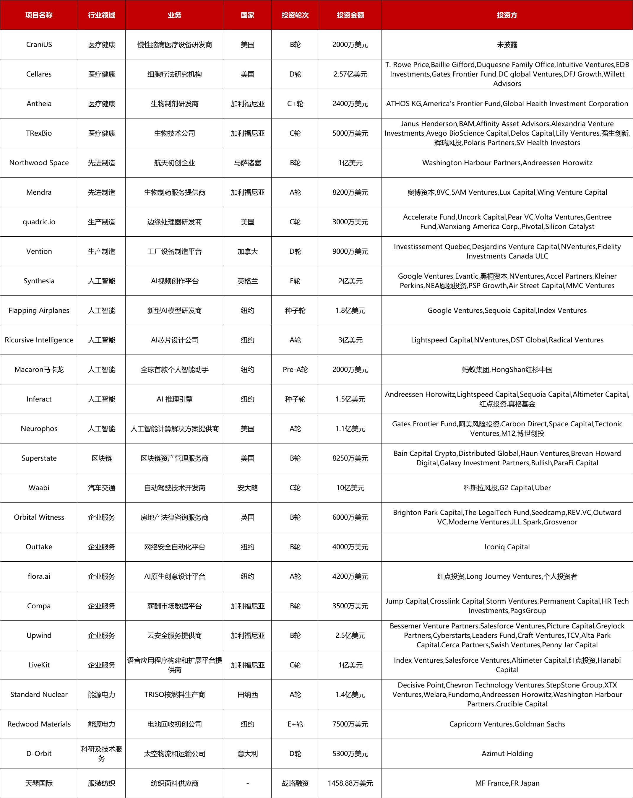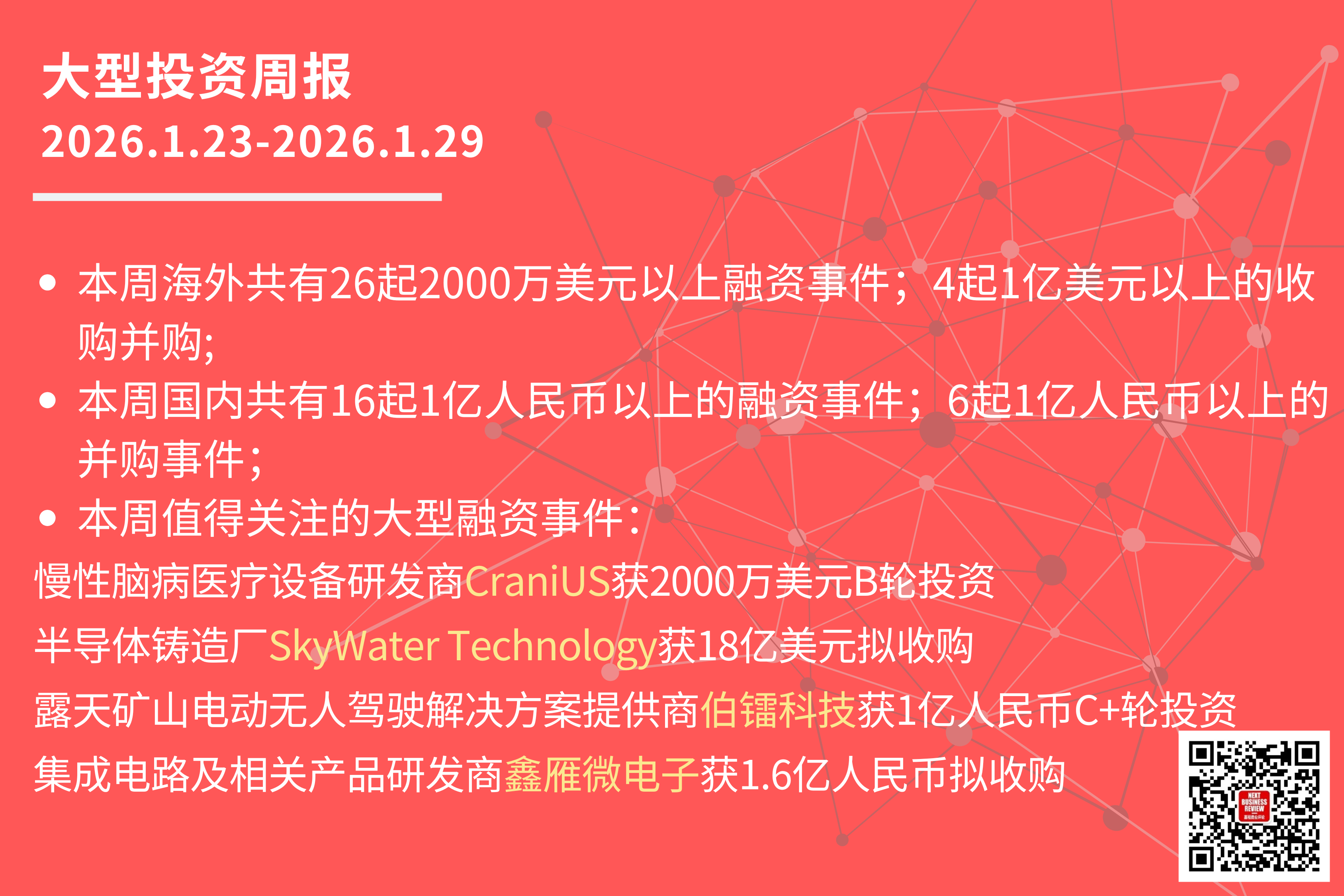本周共有26起2000万美元以上的海外融资事件,其中: